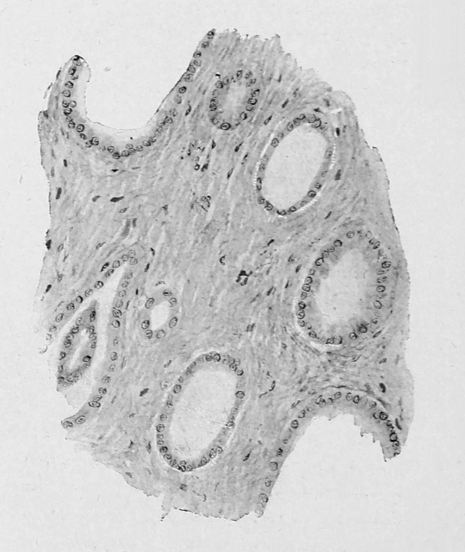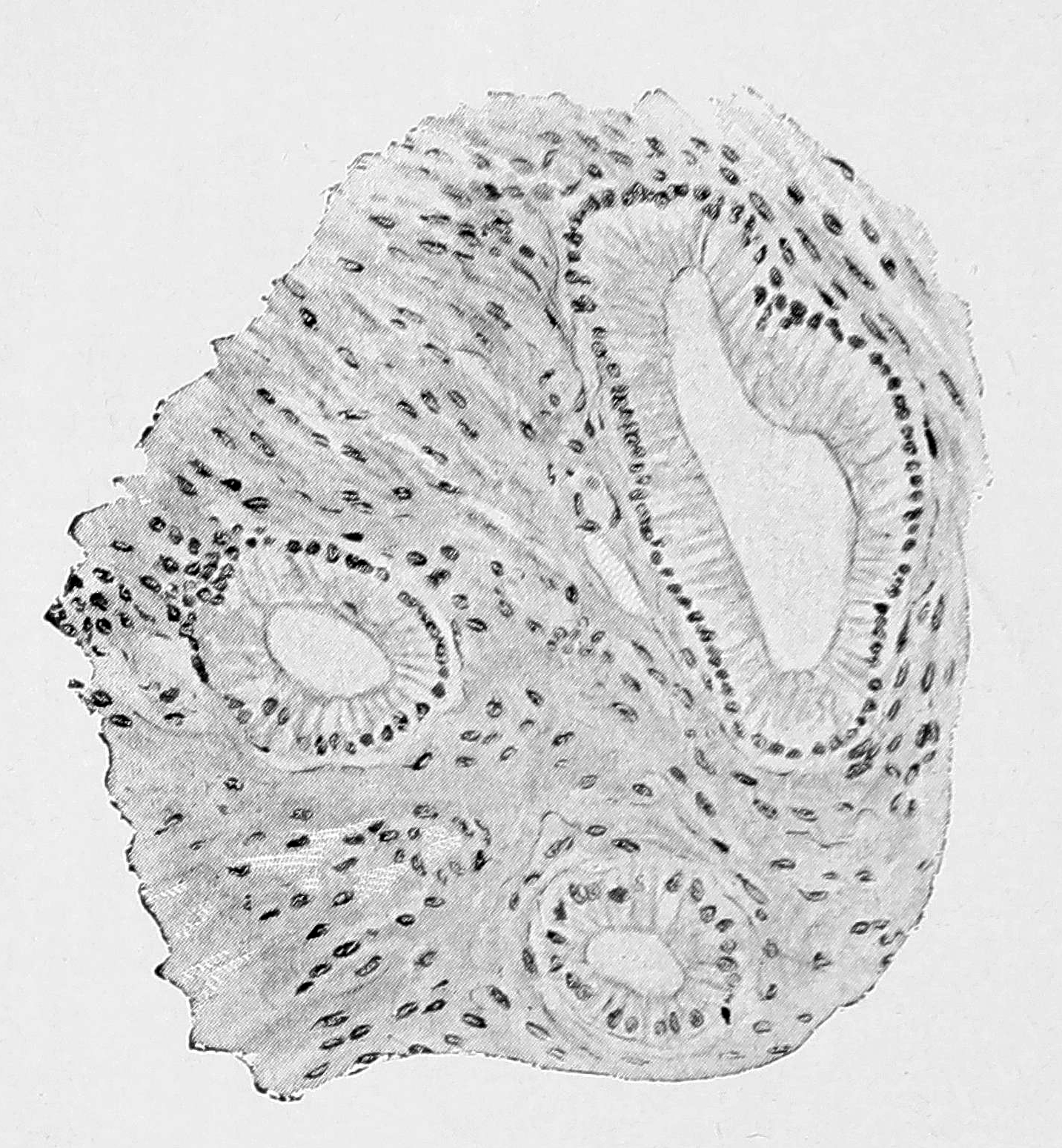 Дело касается 43-летней крестьянки, имевшей 5 родов и 2 выкидыша, с послеродовым заболеванием в анамнезе. У больной установлено было присутствие двусторонних воспалительных опухолей придатков и обширных периметритических спаек, а также найдены глубокие разрывы маточной шейки, сильно ее деформировавшие, с резким выворотом задней губы portionis vaginalis наружу. Произведено полное удаление матки с придатками. При микроскопическом исследовании матки получились весьма интересные картины. Вывороченная кнаружи задняя губа влагалищной части матки казалась занятой бархатистой эрозией. И действительно, это была папиллярная эрозия. Поверхность эрозии была покрыта красивыми папиллярными разростаниями, эпителий которых представлялся то цилиндрическим, то низко-кубическим, местами же был слущен. Разрыхленная подэпителиальная строма состояла из тонко-петлистой ретикулярной ткани, местами инфильтрированной мелкими круглыми клетками, местами содержавшей плазматические клетки, и очень напоминала своим видом строму слизистой оболочки тела матки. В более глубоких слоях ретикулярный характер стромы терялся, но все же она оставалась богатой клеточными элементами, среди которых предобладали уже веретенообразные формы. Вся толща влагалищной части, как в области эрозии, так и в отделах, покрытых уже плоским эпителием, пронизана была массою железистых полостей самой разнообразной величины и формы. По задней стенке матки указанные железистые разростания захватывали не только всю шейку, но распространялись и на тело матки, на протяжение нижних двух третей его, притом в наружных слоях миометрия несколько выше, чем в подслизистом слое. Кнаружи, в боковых отделах шейки, железистые полости достигали почти до параметральной клетчатки. По мере удаления от влагалищной части, где железистые разростания были столь обильны, что местами придавали органу губчатое строение, они становились все менее резко выраженными и на уровне верхней границы своего распространения встречались уже лишь в виде отдельных железистых полостей. Характерным для описанных разростаний являлось строение их эпителия: последний всюду имел характер типичного цервикального эпителия, как-бы находящегося в состоянии секреции, — высокие, цилиндрические, хорошо контурированные клетки его имели характерные, оттесненные к основанию клеток ядра и светлую, слегка зернистую протоплазму, в которой местами можно было видеть светлые вакуоли. В некоторых, сильно растянутых, полостях клетки под влиянием механического растяжения делались значительно ниже, превращаясь иногда почти в пластинчатые элементы. Никаких признаков наслоения или прорыва в сторону окружающей стромы со стороны эпителия полностей нигде установить не удалось.