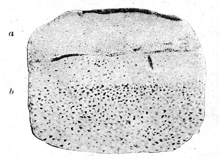 Рис. 1. Сагиттальный срез моторной зоны коры при чистой Jackson’овской эпилепсии: a—pia, b—кора. Окраска по Nіssl'ю. Zeiss. Comp.-oc. 4, Ob. В.