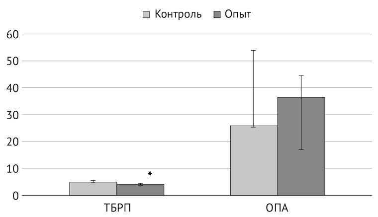 Рис. 1. Сравнение показателей прооксидантного статуса в почках крыс контрольной группы и подопытной группы; ТБРП — тиобарбитурат-реактивные продукты; ОПА — общая прооксидантная активность. По горизонтальной оси — название показателя и единицы измерения. По вертикальной оси — значение показателя. Значения представлены в виде медианы и интерквартильного размаха. Звёздочкой обозначены статистически значимые различия в подопытной группе по сравнению с контрольной