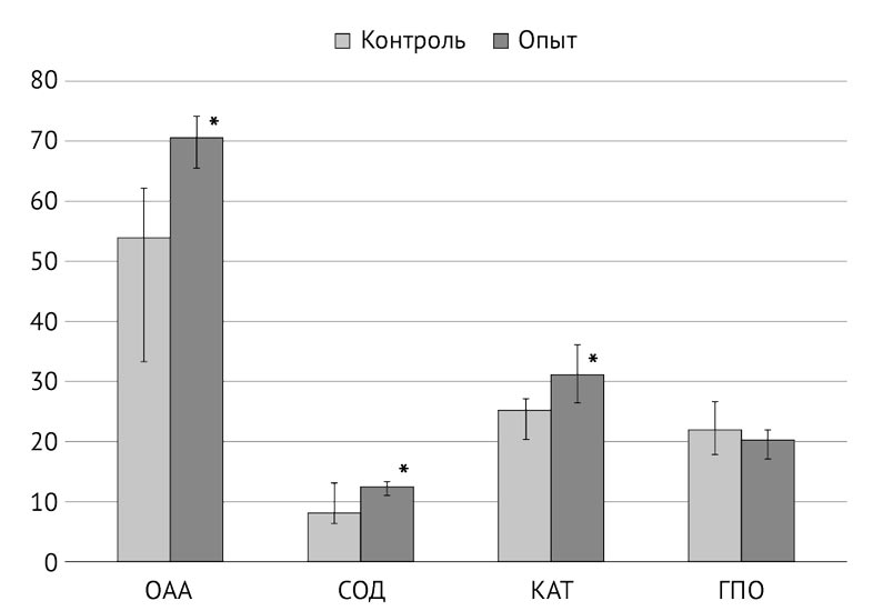 Оценку параметров активности процесса свободнорадикального окисления — концентрации тиобарбитурат-реактивных продуктов, общей прооксидантной активности, общей антиоксидантной активности, активности каталазы, супероксиддисмутазы, глутатионпероксидазы — проводили в соответствии с общепринятыми методиками [11].