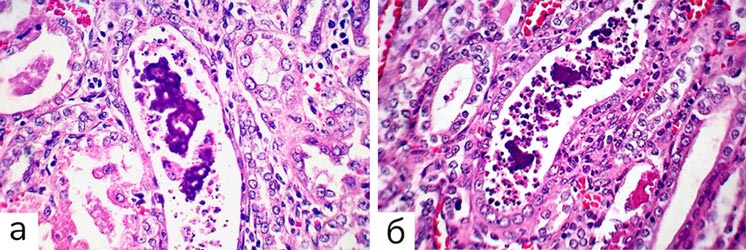 Рис. 3. Гистологическая картина уратного нефролитиаза в почках экспериментальных крыс. Окраска по Коссу. Увеличение ×400: а — уратные депозиты в кистозно-изменённом канальце почки у животного контрольной группы; б — уратные депозиты в канальце почки на 21-й день эксперимента при применении трипептида Leu-Ile-Lys