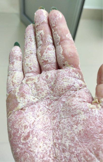 Рис. 2. Пациентка Г.И.Ф. Диагноз: «Эксфолиативный дерматит». Поражение кожи ладоней