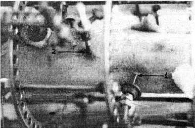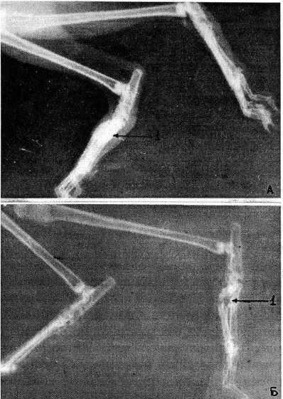 А — опыт № 3/ 1994, кролик. Стрелкой указана зона консолидации перелома без деструкции кости. Срок наблюдения — один месяц. Б — контрольное исследование. Опыт № 4/ 1994 г., кролик. Стрелкой указана зона деструкции кости вследствие развившегося остеомиелита плюсневых костей. Срок наблюдения — один месяц.