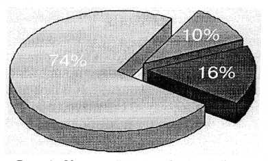 Рис. 1. Удельный вес заболевании респираторной системы в общей структуре профессиональных заболеваний в Республике Татарстан: 10% — пневмокониозы, 16% — профессиональные бронхиты и бронхиальная астма, 74% — другие профзаболевания.