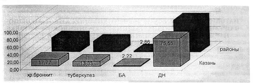 В контакте с промышленными аэрозолями в республике работают около 50000 человек: это формовщики, обрубщики, земледелы литейных цехов крупных машиностроительных предприятий, электро- и газосварщики, шлифовщики, наждачники, полировщики механических цехов и др. Пылевые болезни органов дыхания занимают заметное место в структуре профессиональной заболеваемости в Татарстане (рис. 1).