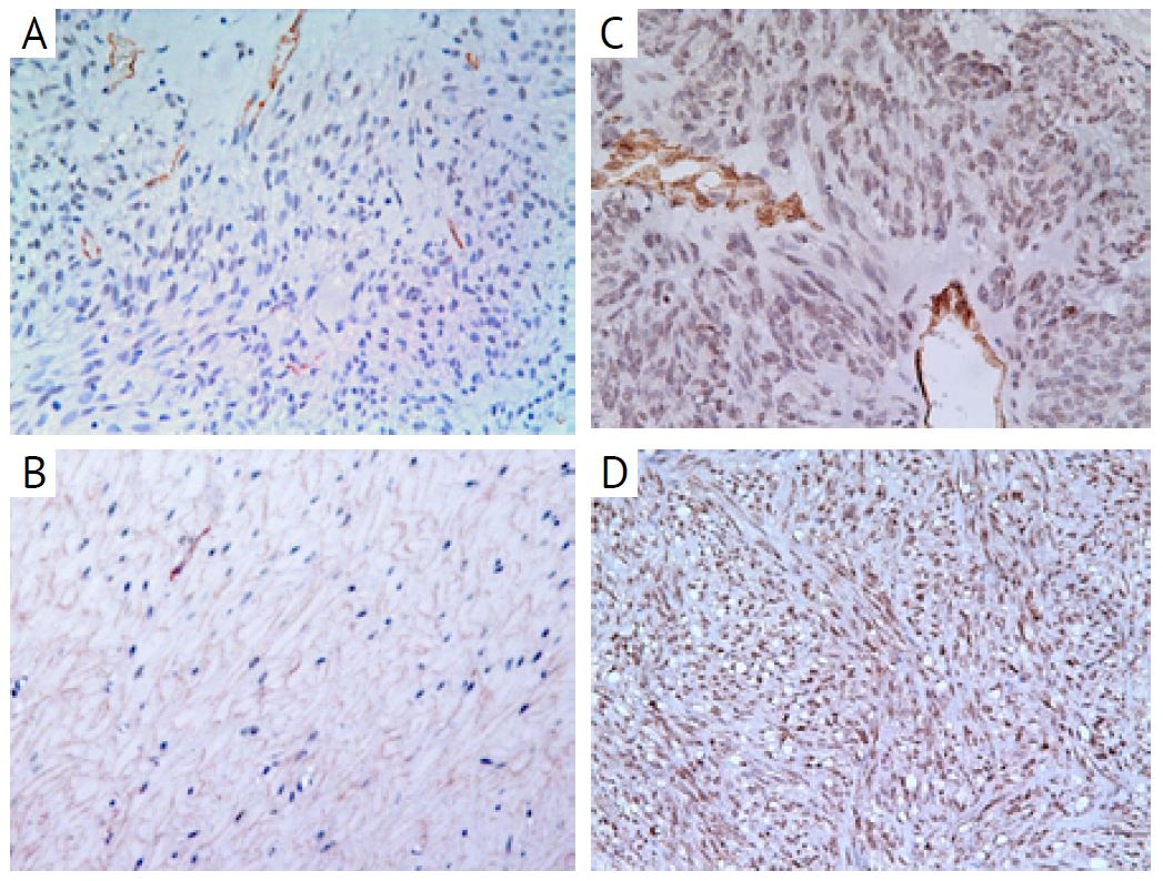 Рис. 1. Экспрессия фактора роста фибробластов-2 в гастроинтестинальных стромальных опухолях (иммуногистохимическое окрашивание): негативная реакция (А); мембранная реакция (В); ядерная реакция умеренной интенсивности (С); яркая ядерная реакция (D)