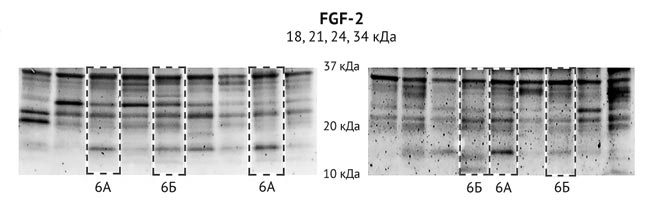 Анализ уровня экспрессии различных изоформ FGF-2 (18, 20, 22,5 и 34 кДа) проводили методом иммуноблоттинга. Лизаты опухолевых тканей получали с помощью радиоиммунопреципитирующего буфера (RIPA), содержащего ингибиторы протеаз и фосфатаз (Sigma, США) с последующим определением концентрации белка в изучаемых образцах. Для детекции FGF-2 использовали соответствующие моноклональные антитела к FGF-2 (клон G2, sc-365106, Santa Cruz) в разведении 1:200.