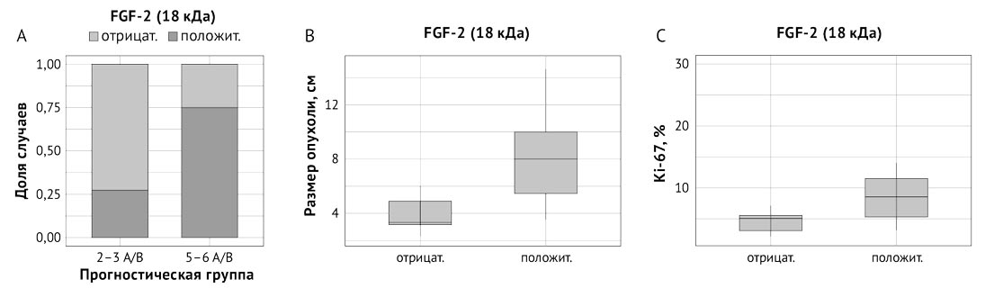 Также обнаружено, что уровень экспрессии низкомолекулярной формы FGF-2 в опухоли был достоверно выше у больных с высоким индексом пролиферации Ki-67 в опухолевой ткани (рис. 3, C) и большим с размером опухоли (рис. 3, B). Важно отметить, что риск рецидивирования также был выше в группе с высоким уровнем экспрессии данной изоформы FGF-2 в опухоли (рис. 3, A) [максимальная экспрессия была отмечена у пациентов 5-й и 6-й прогностических групп (высокий риск рецидива)], что может иметь большое прогностическое значение.