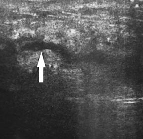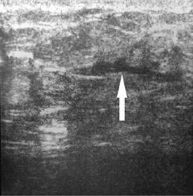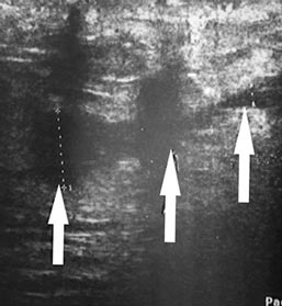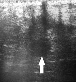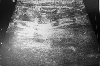 Рис. 5. Ультразвуковая картина передней брюшной стенки живота того же больного (см. рис. 3, 4) на 7-е сутки после лапаротомии. Гипоэхогенная зона в области белой линии живота отсутствует. Определяются гиперэхогенные участки