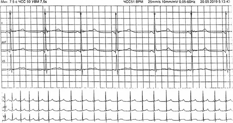 Семейный анамнез и наследственность. Мать умерла в 48 лет во сне (предположительно от внезапной сердечной смерти). У матери были артериальная гипертензия и эпизоды потери сознания, возникающие в положении лёжа, в состоянии покоя, длительностью 5 мин, восстанавливались самостоятельно, родственники делали ей искусственное дыхание. Её ЭКГ недоступна. У старшей сестры (36 лет) и её детей данные ЭКГ без патологии.