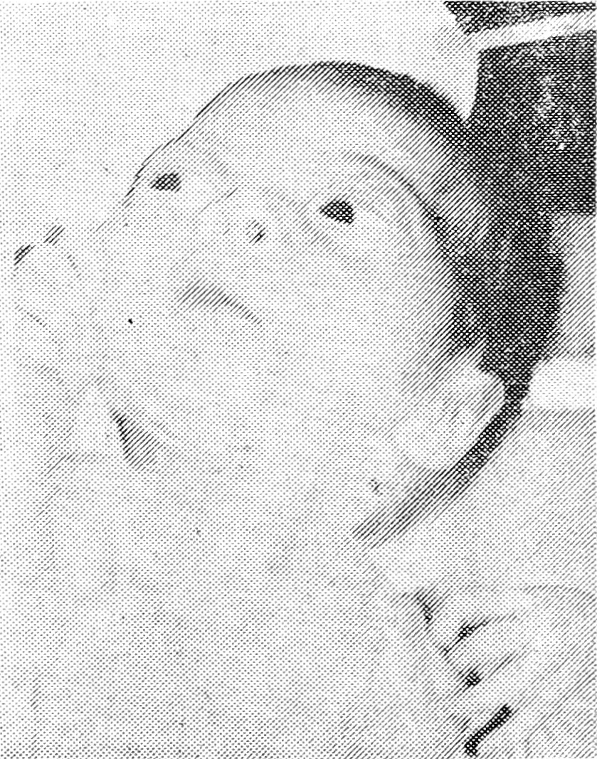 При поступлении состояние ребенка было крайне тяжелым. Резко выражены симптомы дыхательной недостаточности: одышка, общий цианоз, участие вспомогательных мышц в акте дыхания, пена у рта. Дыхание шумное с апноэ. Обращало на себя внимание строение лицевой части черепа: узкий скошенный лоб, резкий экзофтальм, маленькая запавшая нижняя челюсть, «развернутые» ноздри (рис. 1). В полости рта — маленький язык, не достигающий альвеолярной дуги нижней челюсти, расщелина твердого нёба. Частые асфиксии из-за западения языка к глотке. Кости черепа мягкие, родничок большой (4X4 см), расхождение сагиттального шва на 0,3 см. В левой теменной области — кефалогематома. Питание понижено. Масса тела при поступлении — 1800 г. Имеются признаки недоношенности и внутриутробной гипотрофии. Грудная клетка воронкообразная, во время вдоха происходит глубокое западение грудины. Частота дыхания— 72—76 в 1 мин. При перкуссии определяется укорочение звука в паравертебральной области, на остальных участках — с коробочным оттенком. При аускультации выслушиваются жесткое дыхание, мелкопузырчатые влажные хрипы. Сердечные тоны умеренно приглушены, границы сердца не расширены. Частота пульса — 120—148 уд. в 1 мин. Живот мягкий, печень и селезенка не увеличены. Стул кашицеобразный, без патологических примесей; мочеиспускание свободное.