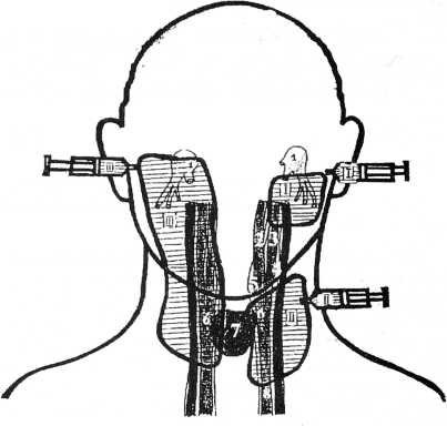 При ТСБ по Жакову эффект химической невротомии связан с бассейном производной наружной сонной артерии — верхнечелюстной артерией с ее адвентициальным симпатическим волокном. При этом воздействие на блуждающий нерв исключалось из-за малого количества анестетика (10— 12 мл), так как последний, локализуясь лишь в подвисочной и крылонебной ямках, действует на II и III ветви тройничного нерва с эффектом обезболивания тканей челюстно-лицевой области.