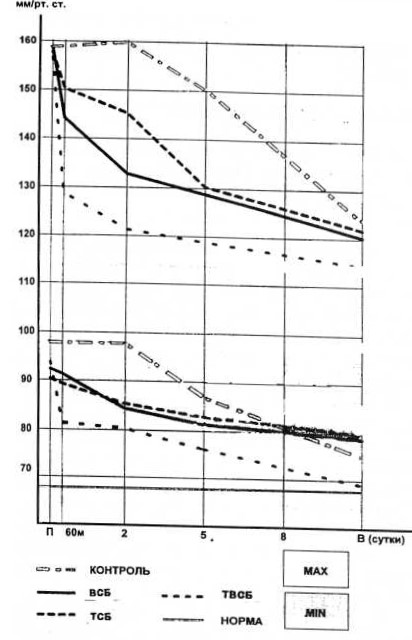 У больных после ТСБ САД понижалось всего на 2% (Р>0,05), на 2-е сутки — на 2,9% (Р>0,05), оставаясь ко дню выписки относительно высоким. АДСЛ снижалось через 60 минут на 6,42% (Р <0,05), на 2-е сутки — на 7,87% (Р <0,05), в день выписки было повышенным.