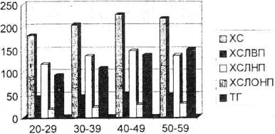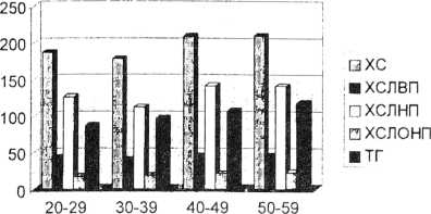 Содержание ХС ЛОНП определяли по формуле ТГ:5. Концентрация ХС ЛОНП варьировала от 0,26 до 1,06 ммоль/л, среднее содержание ХС ЛОНП составило 0,49 ммоль/л. С уровнем общего ХС этот показатель не коррелировал, но был слабо связан с уровнем ХС Л ВП (r = -0,23; Р≤0,05). У нормолипидемичныхлиц прослеживалась слабая положительная корреляция уровня ХС ЛОНП с возрастом (r = 0,32; Р≤0,05).