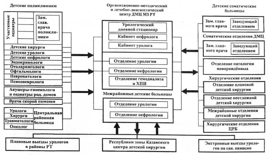 При оказании медицинской помощи урологическим больным силами детских лечебно-профилактических учреждений необходима четкая регламентация функций различных подразделений педиатрической сети (см. схему) с учетом их реальных материально-технических и кадровых возможностей. В настоящее время такая необходимость назрела относительно объема их функций по диагностике, хирургическому и консервативному лечению урологических заболеваний у детей, диспансеризации и реабилитации больных. Особого внимания в этом плане требуют следующие звенья детского здравоохранения Республики Татарстан: первое звено — детская поликлиника (участковый педиатр, детские хирург, уролог, нефролог, эндокринолог, невропатолог), второе — детский соматический стационар, детские нефрологическое (койки), неврологическое и эндокринологическое отделения, третье — детские хирургическое и урологическое (койки) отделения, хирургические отделения городских и центральных районных больниц, оказывающие неотложную медицинскую помощь детям малых городов и сельских районов.