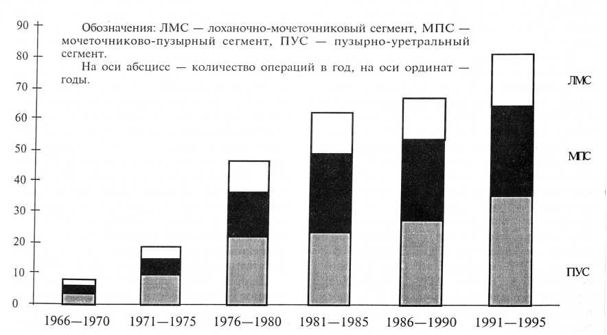 В первый период число урологических больных в клинике определялось уровнем пассивной обращаемости детей. 70% больных поступали в отделение без направлений, 25% — по направлению педиатра или детского хирурга поликлиники и только 5% — из детских больниц. Программа обследования больных на догоспитальном этапе включала лишь общие анализы крови и мочи, а также редко обзорную или экскреторную урографию. За этот период в клинике детской хирургии были лечены 1193 урологических пациента, 597 из них прооперированы.1