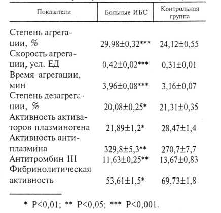 Нами обнаружены значительные нарушения в системе гемостаза у больных ИБС, что согласуется с литературными данными [3, 4, 7]. При проведении манжеточной пробы у больных, в отличие от здоровых лиц, не выявлено понижения агрегационной активности тромбоцитов. Наблюдались повышение скорости и степени агрегации, увеличение времени агрегации, снижение степени дезагрегации, что связано с отсутствием выброса из эндотелия стенки сосудов простациклина, антикоагулянтов и активаторов фибринолиза, улучшающих реологические свойства крови. На фоне высокой функциональной активности тромбоцитов имели место снижение активности активаторов плазминогена, повышение антиплазминовой активности, а также низкий уровень антитромбина III, который, вероятно, расходуется на предотвращение перехода протромбина в тромбин. Статистический анализ показал достоверно более низкий уровень фибринолитической активности у обследованных больных (табл. 1).