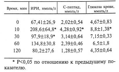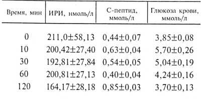 На 60-й минуте содержание ИРИ вновь увеличивалось (II фаза инсулиновой секреции). Уровень глюкозы крови снижался до нормы после кратковременного его подъема на 10-й минуте (табл. 2).