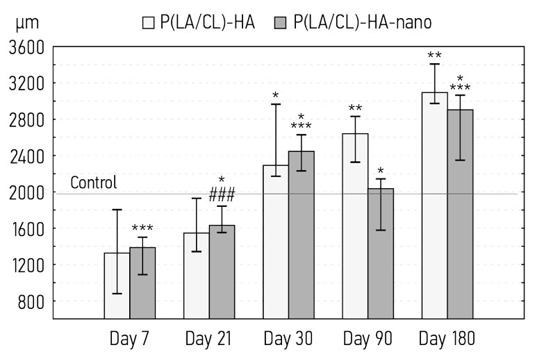 Figure 1. Dermal thickness (µm) (Wilcoxon signed-rank test). Each box plot represents the median and first (Q1) and third (Q3) quartiles. *, Significant difference between study time points. **, Significant difference between thread types. ***, Significant difference between the P(LA/CL)-HA-nano and control groups. ###, Changes between the P(LA/CL)-HA-nano and control reached statistical significance.