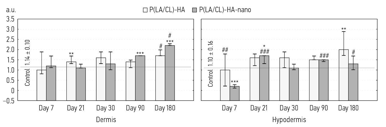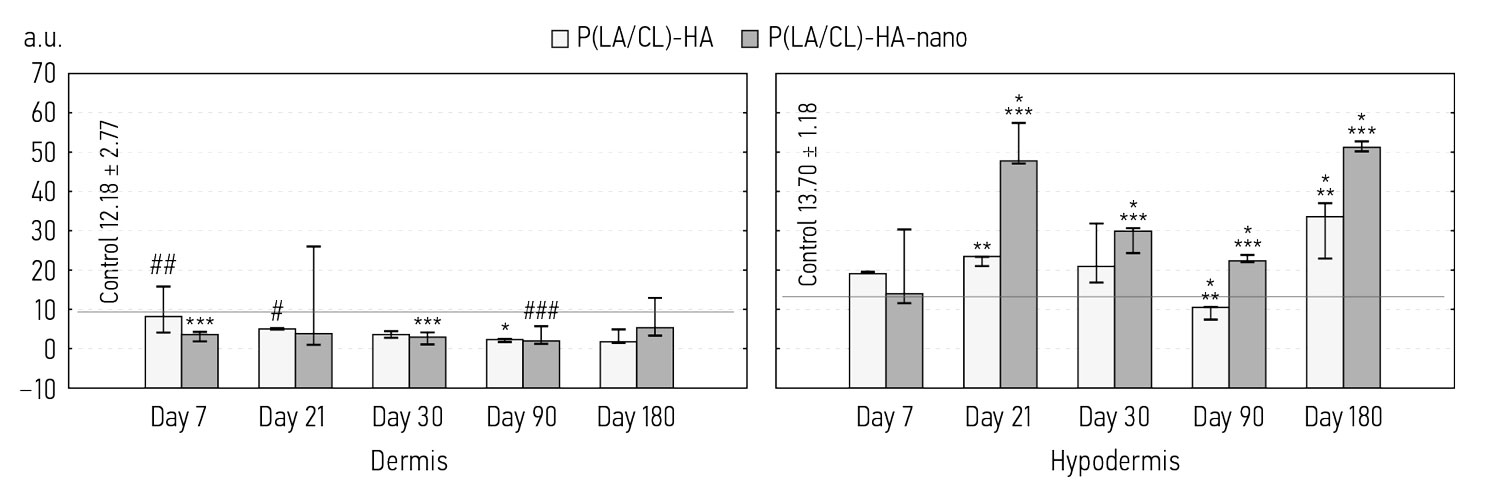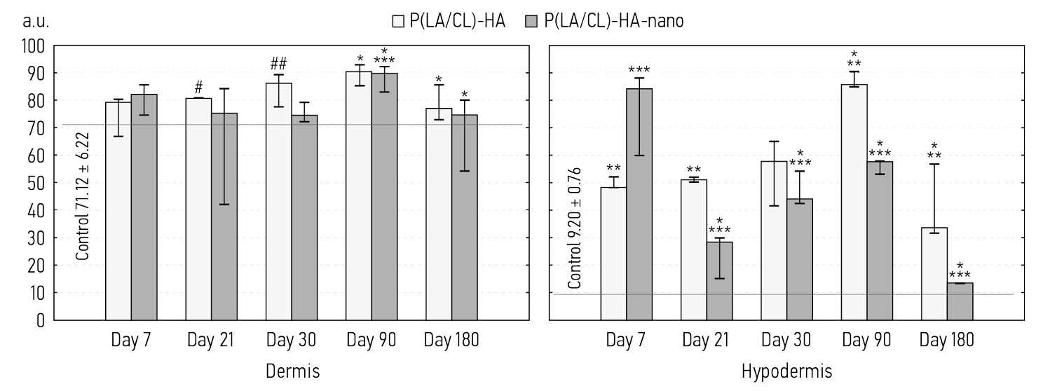 Figure 2. Density of type I collagen fibers in the dermis and hypodermis, arbitrary units (pixel intensity) (a.u.) (Wilcoxon signed-rank test). Each box plot displays the median and first (Q1) and third (Q3) quartiles. *, Significant difference between study time points. **, Significant difference between thread types. ***, Significant difference between the P(LA/CL)-HA-nano and control groups. #, Changes over time reached statistical significance. ##, Difference between thread types reached statistical significance.