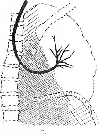 Правое легкое без патологических изменений. Через 1,5 месяца после операции у больного появились кашель с гнойной мокротой и периодическое повышение температуры. Эти явления постепенно нарастали. Через 2 года после операции больной обратился с жалобами на кашель с большим количеством гнойной мокроты. Можно было предположить бронхиальный свищ.