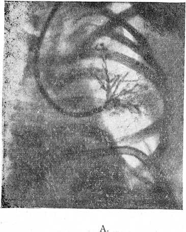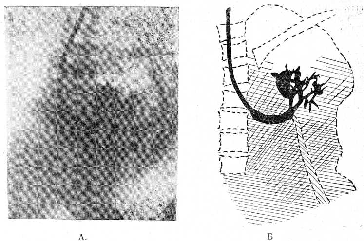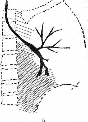 Рис.3 Б Бронхограмма больного М., 38 лет. На бронхограмме левого легкого до операции видны бронхоэктазы в нижней доле и в язычковом отделе. Бронхи верхней зоны не изменены (йодолипол в альвеолах)