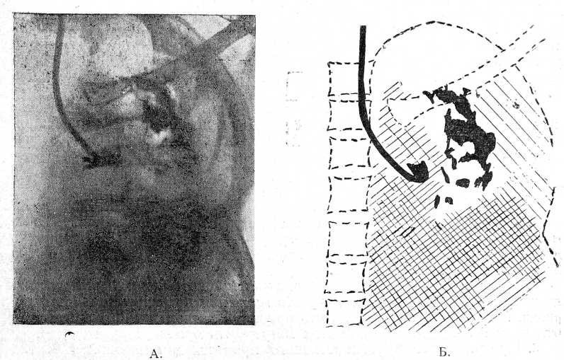 Правое легкое без патологических изменений. Через 1,5 месяца после операции у больного появились кашель с гнойной мокротой и периодическое повышение температуры. Эти явления постепенно нарастали. Через 2 года после операции больной обратился с жалобами на кашель с большим количеством гнойной мокроты. Можно было предположить бронхиальный свищ.