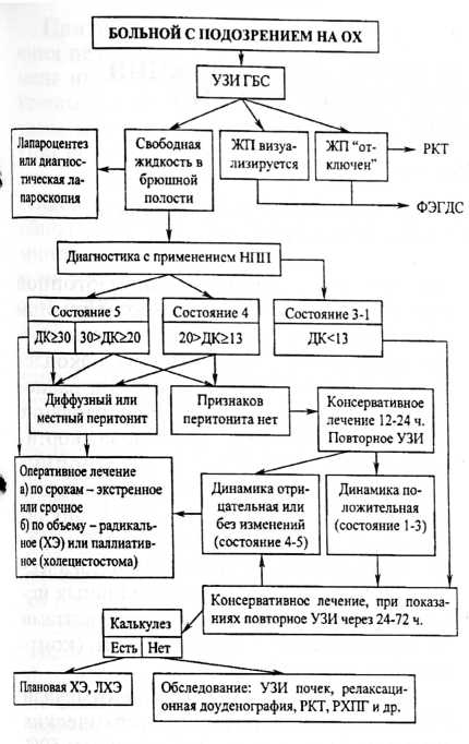 На схеме представлен рекомендуемый нами алгоритм диагностики при подозрении у больного острого деструктивного холецистита. На первом этапе проводят УЗИ ГБС с последующей процедурой распознавания острого деструктивного холецистита при помощи рабочей табл. 1, а также ФЭГДС. После этого принимают решение о необходимости экстренного или срочного оперативного вмешательства либо консервативной терапии и дальнейшего динамического наблюдения. На втором этапе, если имеются показания, производят обследование пациента с применением контрастного исследования желудка, релаксационной дуоденографии, РКТ, РХПГ.