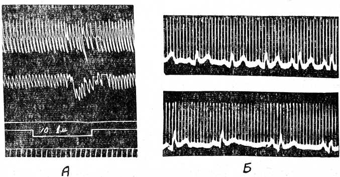 1 отмечались двухфазные реакции в виде начального угнетения, иногда вплоть до кратковременной остановки, с последующим возбуждением; кровяное давление чаще было снижено (см. рис. 3 —А).