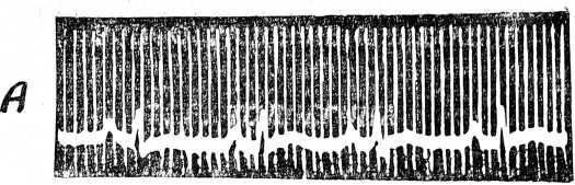 были наиболее закономерны усиление и учащение дыхательных движений, но в некоторых опытах наблюдалось угнетение дыхания; кровяное давление чаще снижалось; на электрокардиограмме отмечались изменения высоты зубца R (чаще — снижение), уменьшение зубца Т, в единичных случаях — смещение сегмента S Т (см. рис. 2); частота сердечной деятельности менялась чаще в сторону замедления, реже—учащения сердечных сокращений (см. рис. 1 — Б).