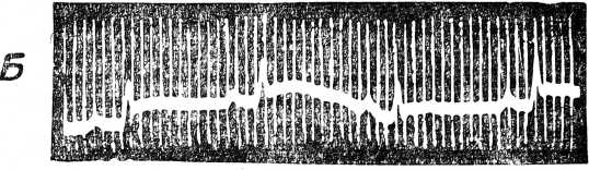 Проведенное изучение изменений ЭКГ, кровяного давления и дыхания показало, что уже при слабых раздражениях желчного пузыря изменяются изучаемые нами показатели. В части опытов изменения были значительными (см. рис. 1 — А и 1 — Б). Со стороны дыхания