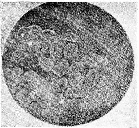 Анализ крови 13/1 1953 г.: эр.— 4 310 000, гем.— 55%, ц. п.— 0,6, Л.— 5000, п.— 2, с.— 81, лимф.— 17, РОЭ — 40 мм в час. 23/II — при исследовании дуоденального 'содержимого обнаружены личинки Strongyloides stercoralis.