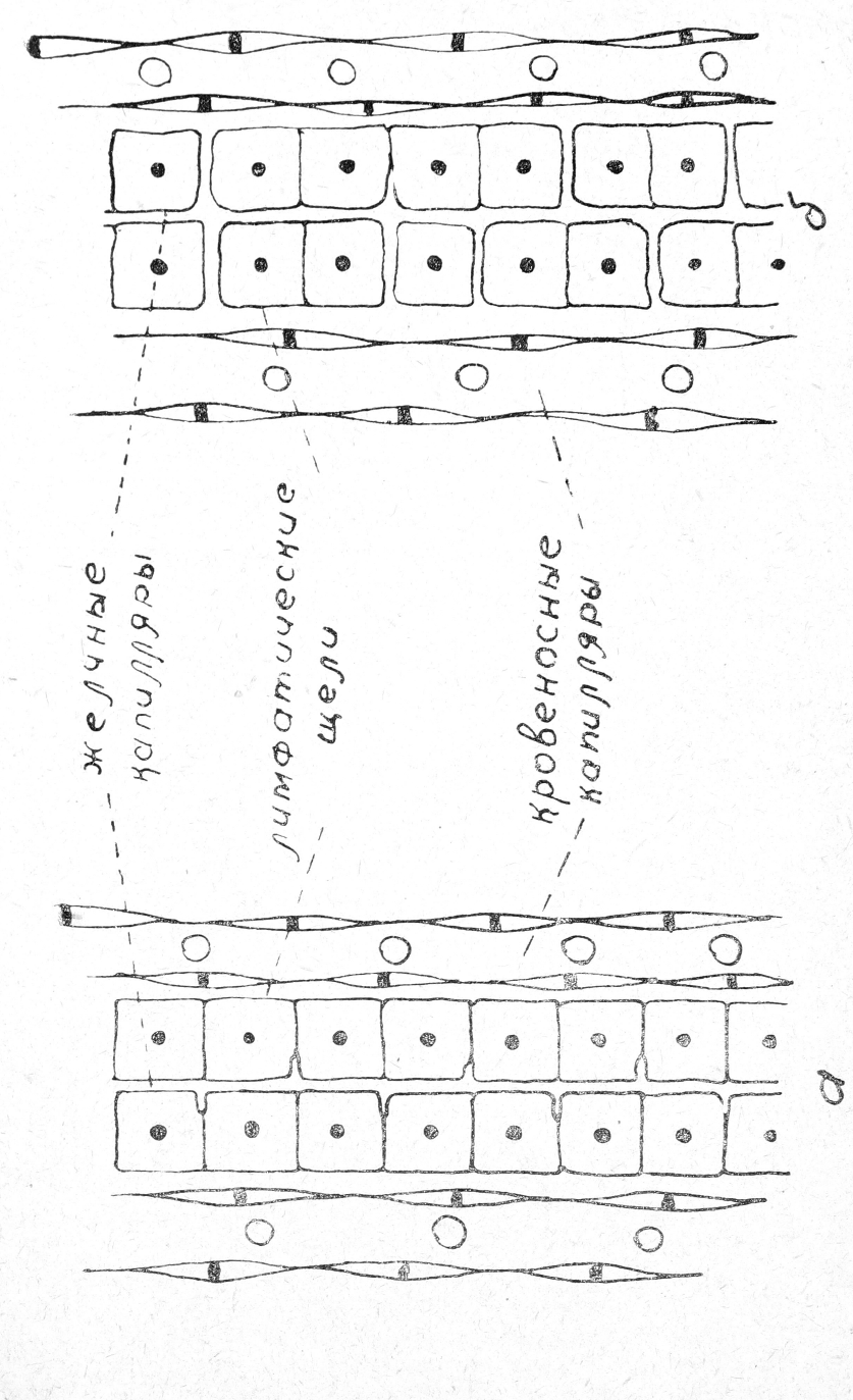 Эппингер, изучавший механизм возникновения застойной желтухи, установил, что при существовании механических препятствий к оттоку желчи происходит сильное расширение желчных капиля. ров, которые настолько растягиваются, что доходят до кровеносных и лимфатических пространств печеночных долек. В далеко зашедших случаях могут произойти надрывы в виде воронкоообразных углублений желчных капиляров, и тогда устанавливается непосредственное сообщение между последними и просветом кровеносных и лимфатических сосудов (рис. 1).