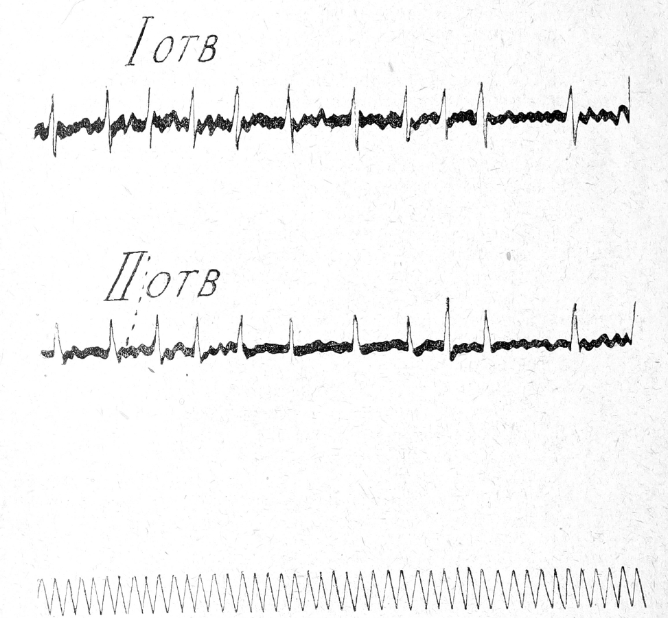 Электрокардиограмма: Arhytmia perpetua, выражающаяся в неравномерных промежутках между отдельными сокращениями. Одному желудочковому сокращению соответствует несколько предсердечных (трепетание предсердий). Отмечается небольшой вольтаж зубцов, дающий основание предполагать изменения в миокарде (рис. 2).
