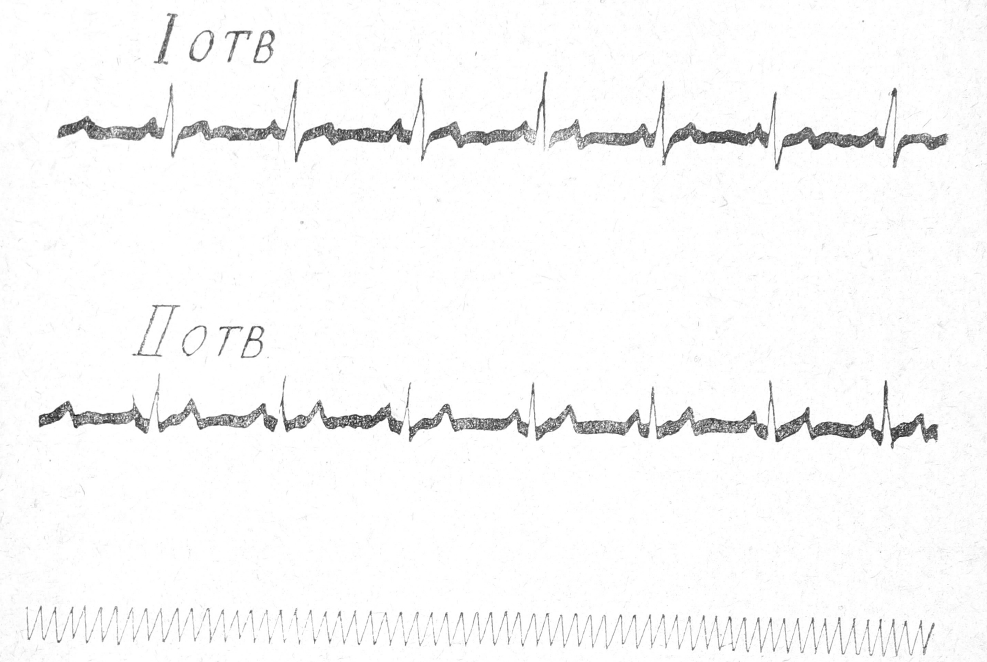 Мало того, наблюдавшееся у больного расширение сердца (поперечник — 16 см) не являлось результатом стойких изменений в сердечной мышце, а явилось, по-видимому, следствием частых нарушений сердечного ритма. После восстановления последнего уменьшилась в размерах и сердечная мышца. По крайней мере, когда больной явился на контрольное обследование в клинику спустя 3 месяца после выписки из нее, с полностью урегулированным под влиянием хинидина сердечным ритмом (п. 76 в; правильный), поперечник сердца сократился до 14,3 см, а экг приняла совершенно нормальный вид, если не считать низкого вольтажа зубцов, который, впрочем, конкретного патогномонического значения не имеет.