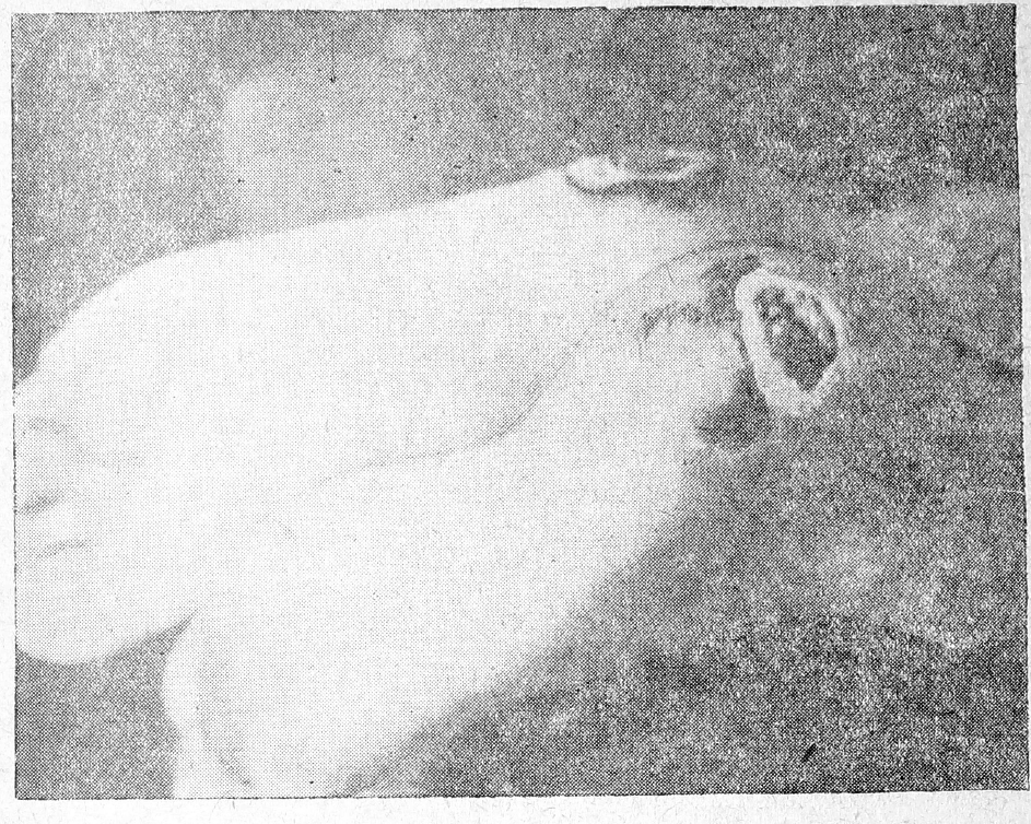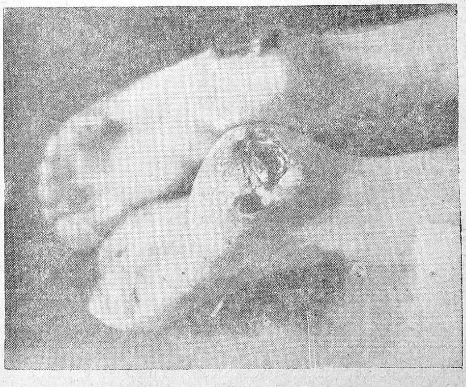 Гемограмма от 5/II. Эритроцитов 4.440.000. Лейкоцитов—8.900. Лейкоцитарная формула: палочкоядерных 0,5%, сегментоядерных 63%, эозинофилов 2%, базофилов 1%, моноцитов 5,5%, лимфоцитов 28%. РОЭ 31 мм в 1 час. В поле зрения в очень большом количестве обнаруживаются полулуния pl. malariae tropicae, RW в крови отрицательная. 31/Х сделан новокаиновый блок по Вишневскому справа. 4/ХІ после блока язва на правой ноге хорошо гранулирует, 10.ХІ сделан повторно блок. 19.ХІ постепенное заживление язв с обильным образованием грануляций. 5.ХII парез n. peroneus sin. менее выражен, полоска гипестезии на передней поверхности голени; хорошо поправился, прибыл в весе, выписывается из клиники.