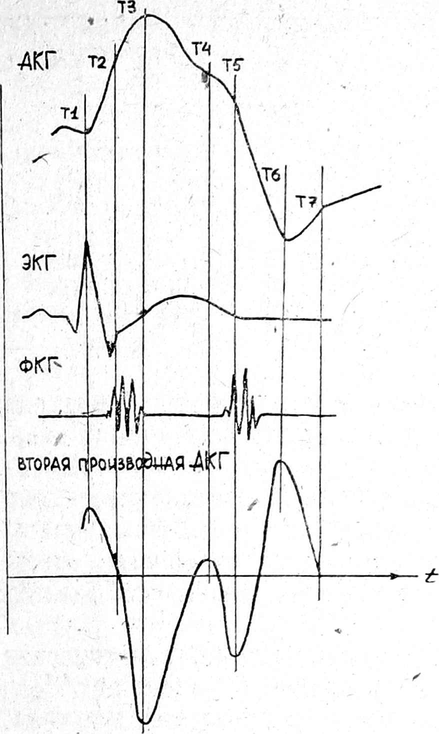 Для сопоставления данных показателей в фазах изгнания, снижения давления (СД) и быстрого наполнения (БН) следует предварительно производить качественный отбор кривых по соотношению амплитуд АКГ в Т2 (открытие аортального клапана) и Т5 (закрытие аортального клапана). Оно, вероятно, должно быть близким к единице при условии, что у обследуемых нет заболеваний, сопровождающихся расширением контуров сердца и высоким конечно-диастолическим давлением в полостях желудочков.