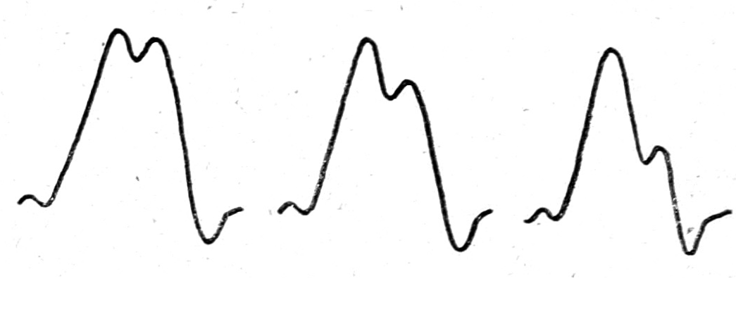 Рис. 2. Возможные варианты формы АКГ, зарегистрированные в области наибольшей пульсации верхушечного толчка у одного и того же здорового человека (постоянная времени используемого датчика давления — 1,3).