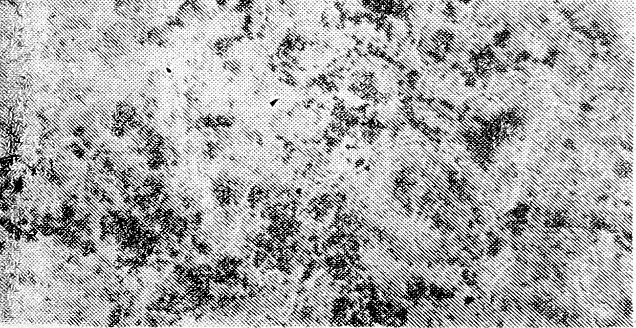 Рис. д — высокая активность кислой фосфатазы в мозговом веществе вилочковой железы у больной Ч. 4,5 лет. Тетрада Фалло, цианотическая форма. Реакция с прочным синим PP. Х 280.