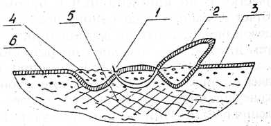 Обозначение: 1 — игла; 2 — кожная пластина; 3, 6 — кожные пластины, уложенные на поверхность грануляций; 4 — грануляционная ткань; 5 — подгрануляционный слой.