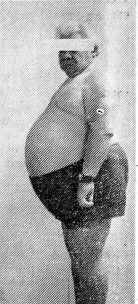 Больной наблюдается нами в течение 8 лет. Масса тела продолжает нарастать (при осмотре в 1985 г.— 160 кг), легочно-сердечная недостаточность прогрессирует. Состояние несколько улучшается при снижении массы тела, что наблюдается в летнее время.