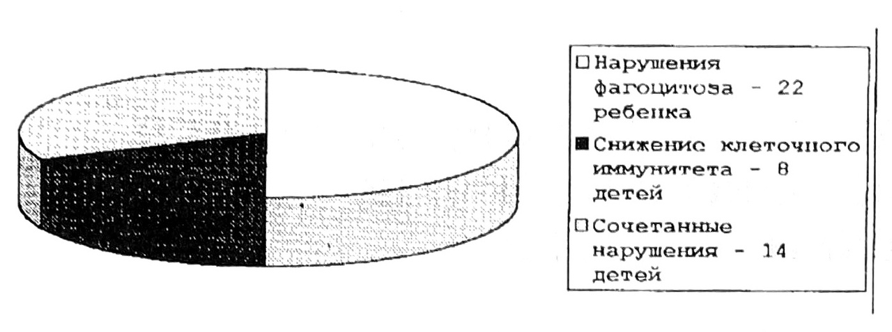 У 26 детей (10 детей с хроническм гайморитом, 16 — с аденоидитом) были исследованы иммунологические показатели на фоне лечения ИРС-19. Структура выявленных изменений иммунитета до лечения препаратом приведена на рисунке.