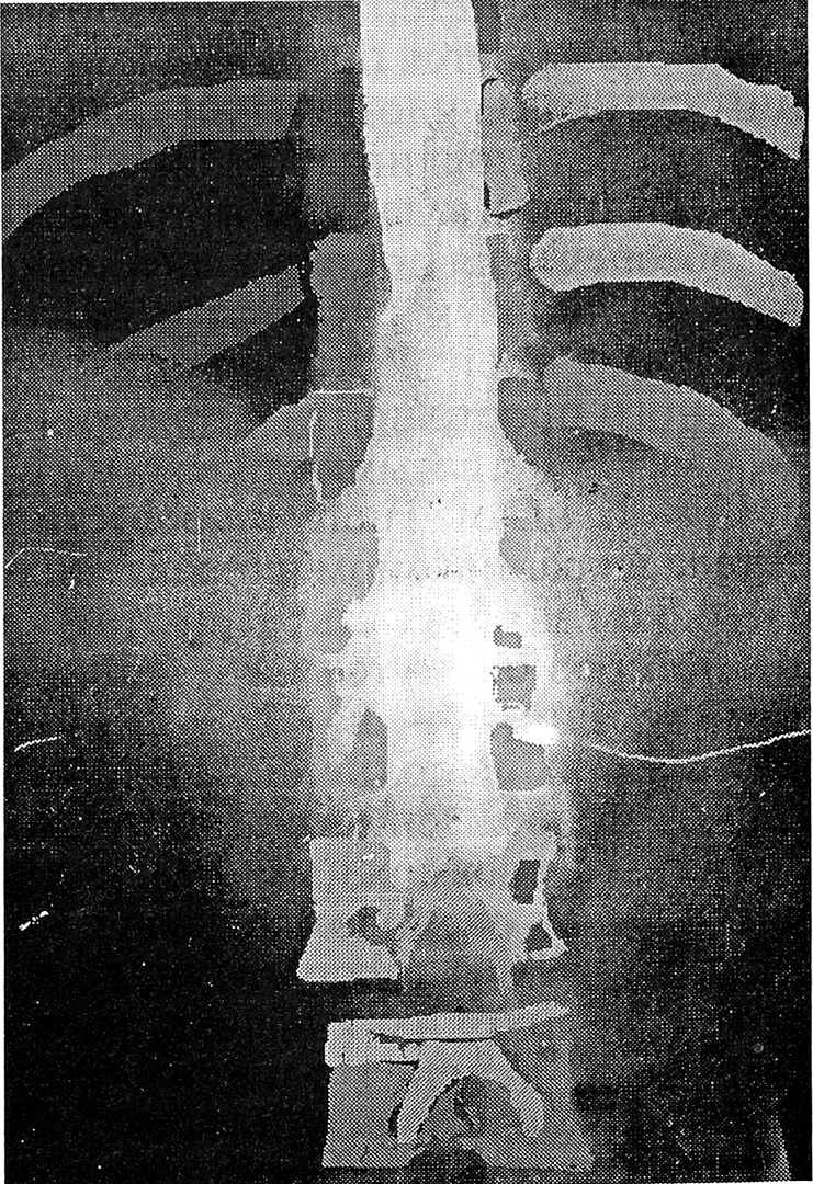Рис.2. Эпидурограмма нижнегрудного и верхней части поясничного отдела эпидурального пространства. Контрастирование паравертебрального пространства по ходу спинномозговых нервов через межпозвонковые отверстия с Ь2 по ThH. Симптом “железной дороги” с Ц по Th9. В синхронном режиме введены через расположенный выше катетер 5,5 мл омнипака-300, через расположенный ниже — 5,5 мл реополиглюкина (изоосмотичен омнипаку-300, одной с ним вязкости). Катетеры рентгеноконтрастные. Расположенный выше катетер проведен через эпидуральный прокол на уровне L2—Ц + 4 см в краниальном направлении за срез иглы, нижний катетер — через эпидуральный прокол на уровне L3—L4, также +4 см за срез иглы в краниальном направлении. Контраст продвигается вверх, в грудной отдел эпидурального пространства. Эпидурограмма выполнена с целью верификации с согласия больного