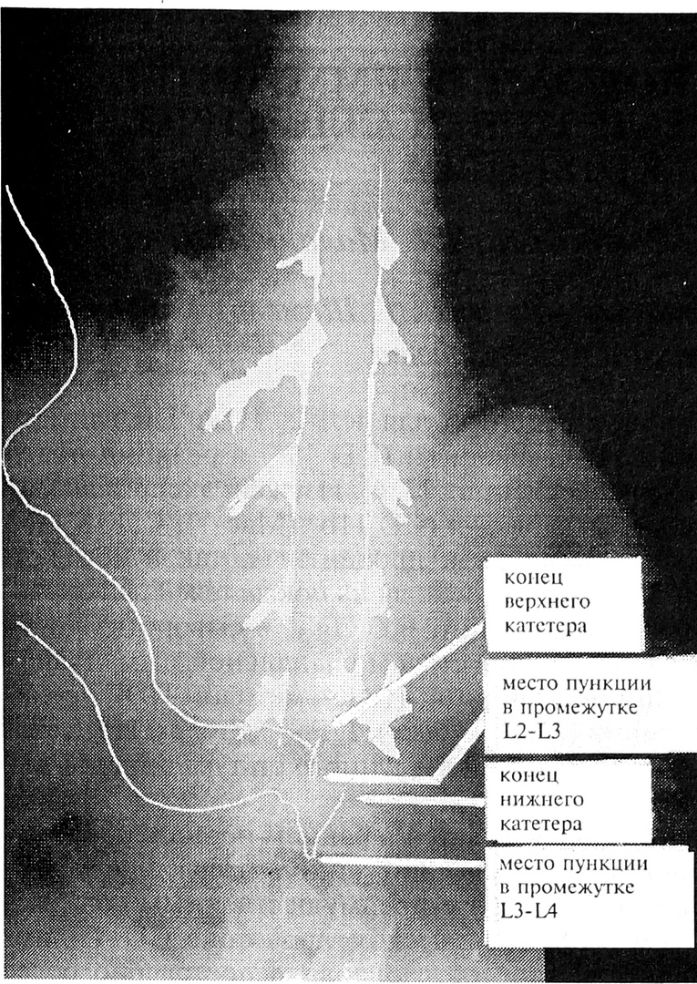 С целью визуализации предлагаемого метода исследование заканчивали введением контрастного раствора, состоящего из омнипака-350 и 10% раствора лидокаина в соотношении 9:1 через верхний катетер. В то же время через нижний катетер синхронно вводили равный объем рентгенонегативного, фармакологически индифферентного раствора аналогичной вязкости с последующей рентгенографией. Рентгенограммы наглядно подтверждали движение рентгенопозитивного раствора, введенного через верхний катетер, в краниальную сторону, а рентгенонегативного — в каудальном направлении, при этом граница соприкосновения растворов незначительно размывалась (рис. 1 и 2).