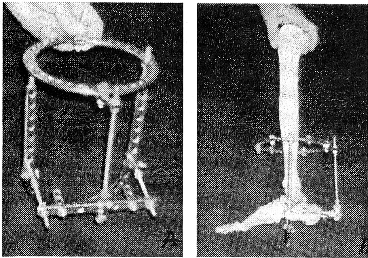 Рис. 1. Компоновка аппарата Илизарова. А — аппарат, Б — на костном муляже.