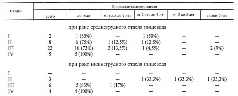 Мы располагаем наблюдениями 127 больных раком пищевода, у которых во всех случаях до лечения была проведена цитологическая или гистологическая верификация диагноза рака пищевода. Возраст 103 мужчин составлял в среднем 67 лет, 24 женщин — 72 года. В настоящее исследование были включены только первичные больные с 1—4 стадией рака пищевода, ранее не получавшие специфической терапии и о которых имеются сведения о продолжительности жизни после лечения. Сроки наблюдения варьировали от 2 до 10 лет. X ДЛТ проводили по радикальной программе с суммарной очаговой дозой (СОД) 60 Гр и по паллиативной программе с СОД не более 45 Гр. Во всех случаях применяли классическое фракционирование. На основании данных топометрической подготовки определяли поля облучения с учетом локализации и размеров очага поражения, в зону включали регионарные лимфатические узлы. Результаты исследования представлены в табл. 1,2.