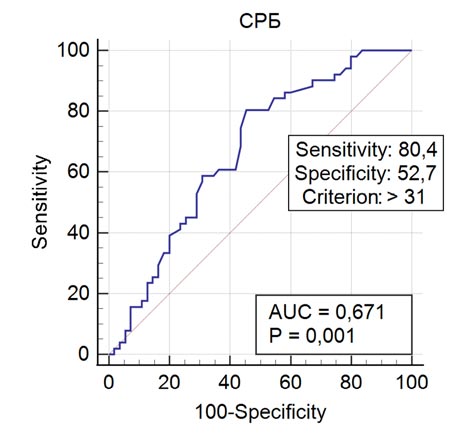 Максимальная диагностическая значимость показателя СРБ для прогноза наличия трофологической недостаточности зарегистрирована при 80,4% чувствительности и 52,7% специфичности (AUC=0,671, 95% доверительный интервал 0,573–0,759, р=0,001), что соответствовало пороговому значению показателя СРБ 31 мг/л (рис. 1).