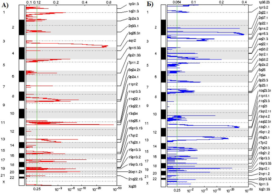 Рис. 1. Геномное положение амплифицированных (А) и делетированных (Б) областей