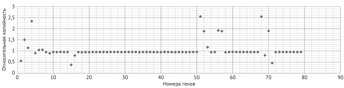 Для определения относительной копийности генов с использованием базы данных NCBI GenBank были разработаны последовательности синтетических олигонуклеотидов (праймеров, прямых и обратных) для 81 гена, включая референсные локусы (ACTB, GAPDH). Перечень генов был сформирован на основании предварительного биоинформационного анализа. При выборе референсного гена использовали алгоритм, применённый в работе J. Vandesompele и соавт. [9]: рассчитывали величину M (M-value) и S (Stability, показатель стабильности), равную ln(1/M). Гены со значением M менее 0,4 считали идеальными. В качестве референсных выбрали 2 локуса: GAPDH (M=0,003, S=2,868) и ACTB (M=0,105, S=1,942).