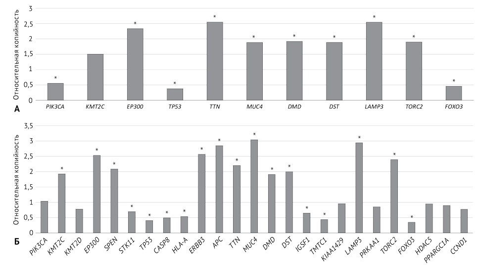 В ходе проведённого исследования обнаружено статистически значимое (p <0,05) увеличение копийности генов KMT2C, EP300, SPEN, ERBB3, APC, TTN, MUC4, DMD, DST, LAMP3, TORC2 и снижение копийности генов STK11, TP53, CASP8, HLA-A, IGSF1, TMTC1 и FOXO3 в клетках первичной опухоли относительно нормальных клеток шейки матки. Следует отметить, что эффект одновременного изменения копийности генов LAMP3, TORC2, ERBB3, APC, HLA-A, TP53 и FOXO3 отмечен у 60% выборки, а изменение копийности генов APC, LAMP3 и TP53 — у 80% выборки (рис. 3, Б).